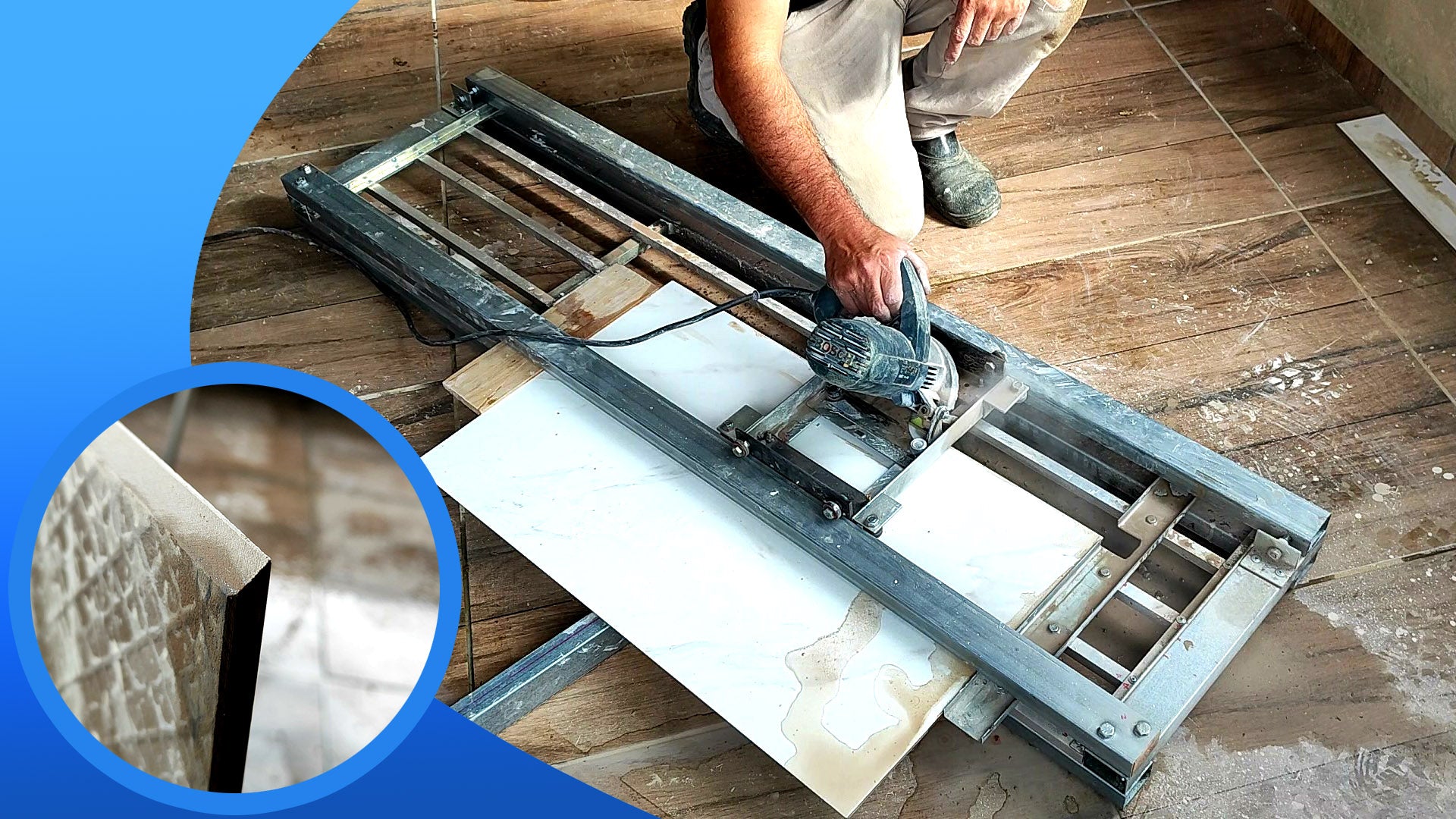 Desenho com as medidas das peças e informações sobre os materiais. Projeto para fazer uma guia de cortes em 45 graus com serra marmore . Esse projeto é para quem gosta de melhorar as próprias ferramentas com materiais alternativos de fácil acesso.